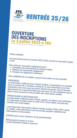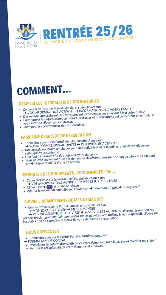 Ce Portail vous permettra de dématérialiser vos démarches périscolaires et extrascolaires (restauration scolaire, ramassage scolaire, temps périscolaires et accueil de loisirs).